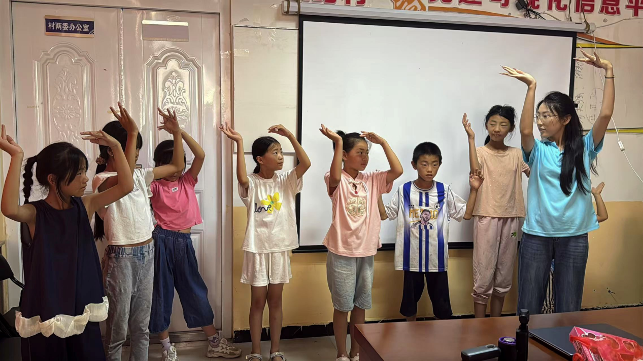 (图为实践团成员为孩子们排练汇演节目,黄子涵供图)