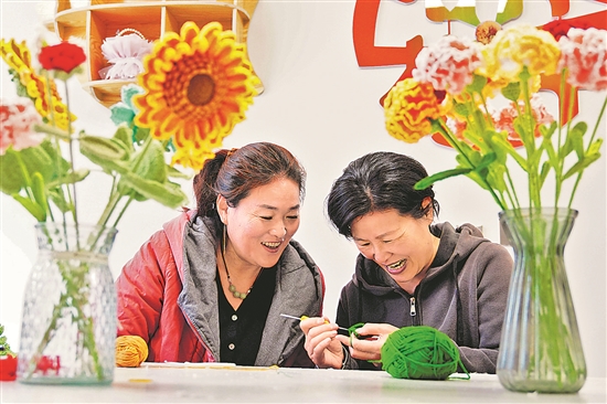 4月14日,在山东省菏泽市巨野县凤凰社区党群服务中心“巧手工坊”,居民正在钩织手工艺品。