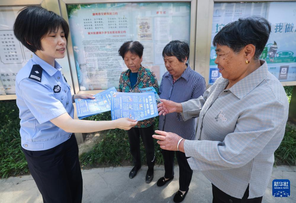 5月14日,道场派出所民警在道场乡浮玉社区给居民发放反诈宣传资料,开展面对面反诈宣传。新华社记者 徐昱 摄