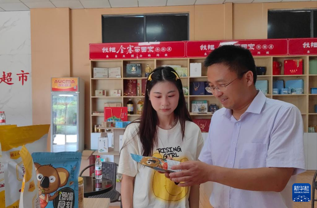 6月14日,在金刚台爱心超市,25岁的返乡青年吴静(左)和国网安徽电力驻金寨县汤家汇镇金刚台村第一书记马静(右)忙着给货架“上新”。新华社记者 马欣然 摄