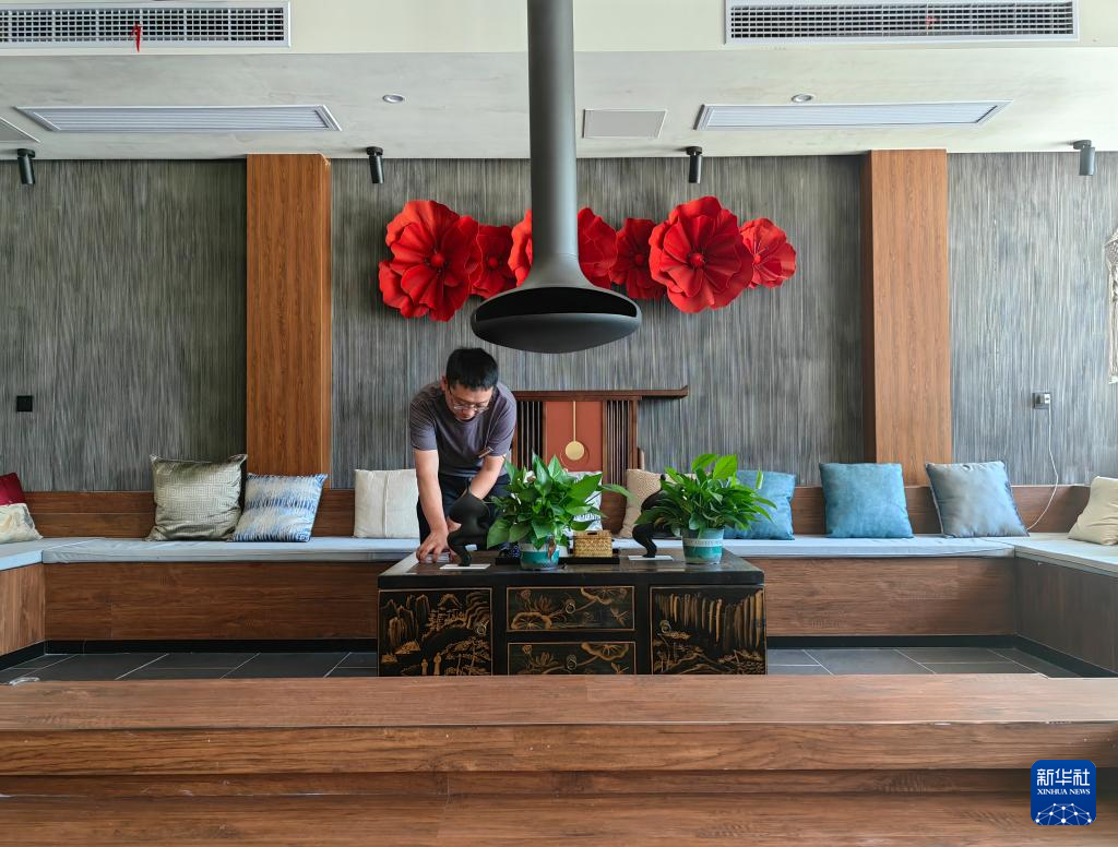 6月14日,金红宾馆经理李立三在前厅进行桌面布置。新华社记者 马欣然 摄