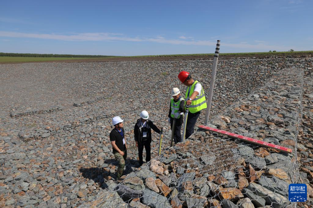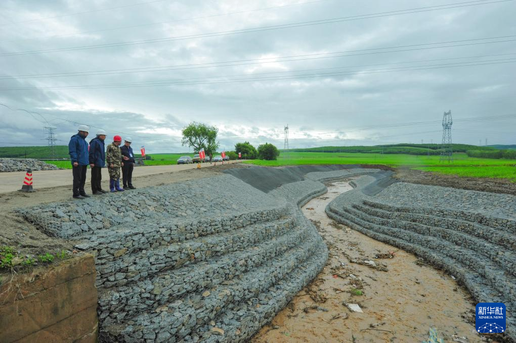 6月23日,在北大荒集团黑龙江友谊农场有限公司侵蚀沟石笼谷坊治理工程现场,技术人员在查验施工效果。