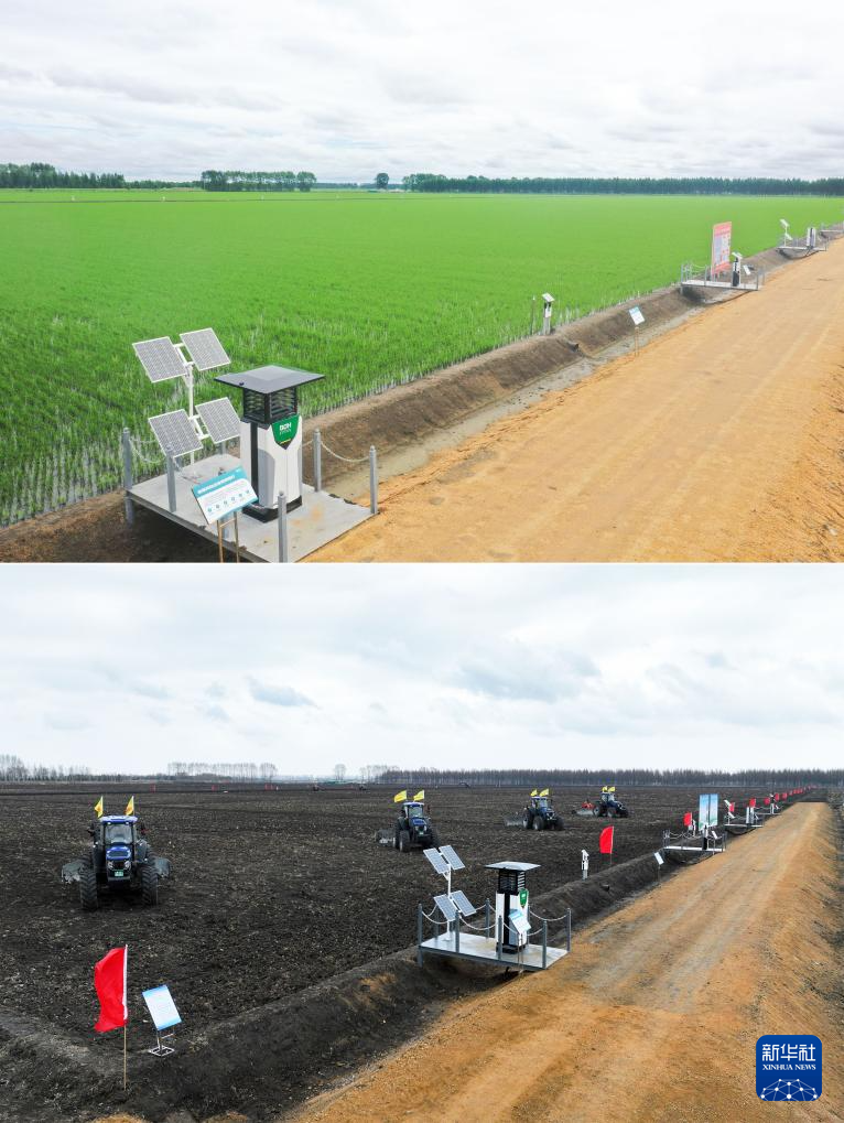 拼版照片:上图为6月23日拍摄的北大荒集团七星农场有限公司通过格田改造后的水稻田(无人机照片);下图为4月16日拍摄的北大荒集团七星农场有限公司机车在水稻格田改造施工现场作业。
