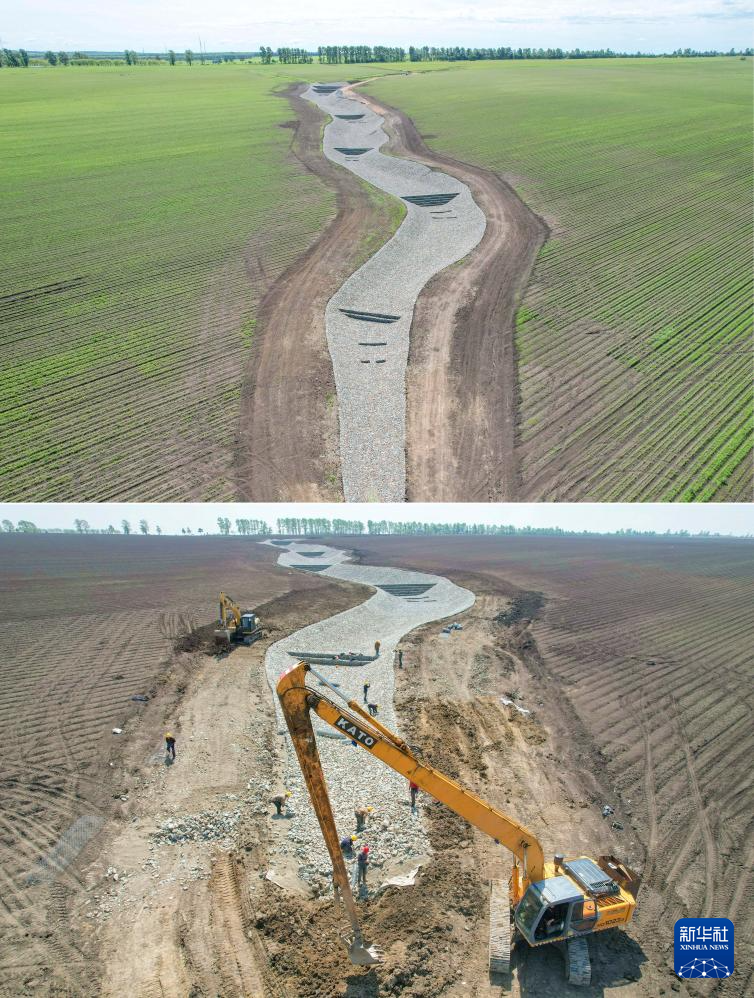 拼版照片:上图为6月24日拍摄的北大荒集团北安分公司二龙山农场有限公司已完工的侵蚀沟治理项目(无人机照片);下图为5月17日拍摄的北大荒集团北安分公司二龙山农场有限公司侵蚀沟治理现场(无人机照片)。